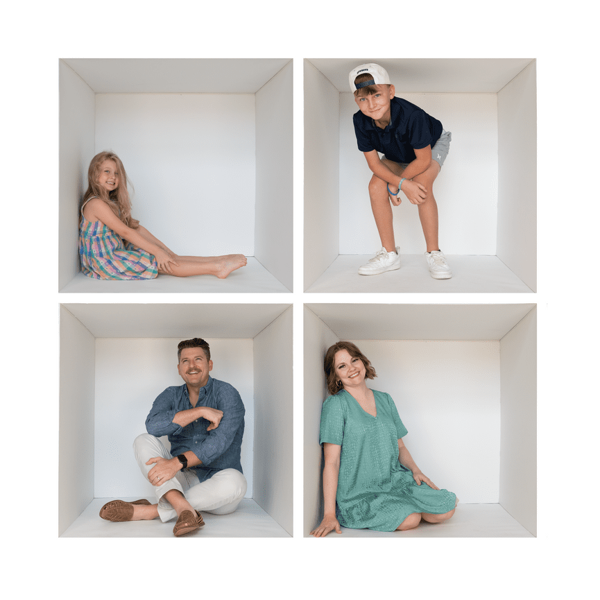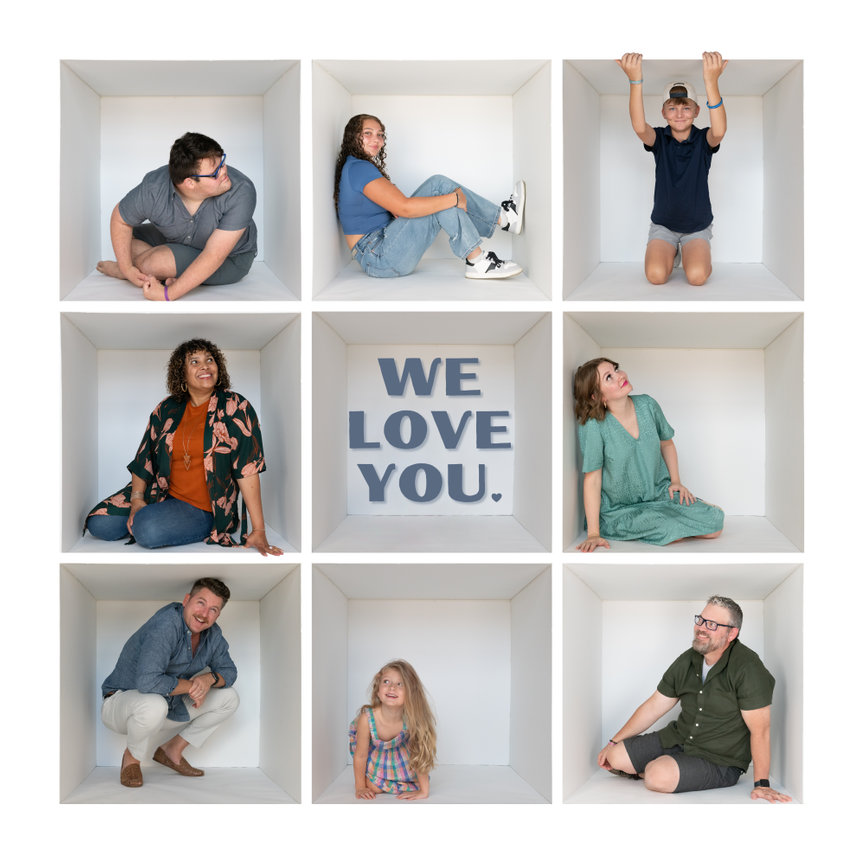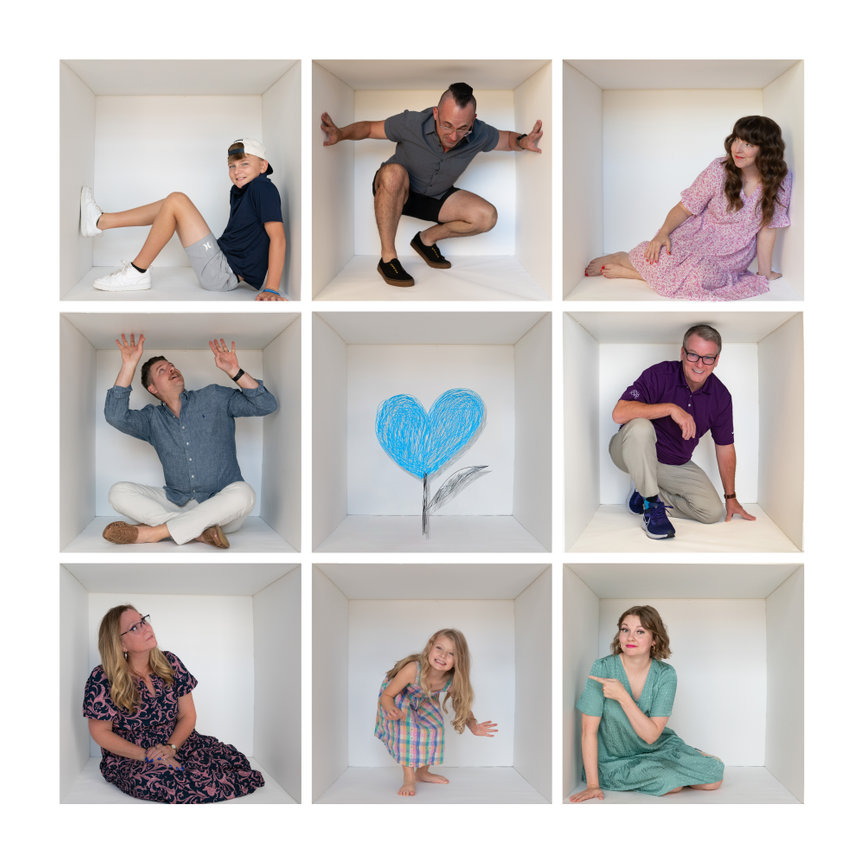 I create a playful, interactive photoshoot where each person (or each idea!) gets their own moment to shine inside the box—kids, siblings, parents, or the whole family together. The result is a collage-style artwork filled with personality, connection, and joy.